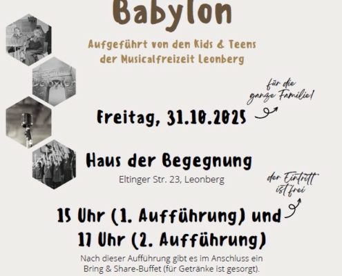 Allgemein, Artikel, News-Startseite, NewsletterAm Freitag, den 31. Oktober 2025 ist es wieder soweit: Die Kids & Teens der Musicalfreizeit Leonberg laden herzlich zur Aufführung des spannenden und berührenden Musicals „Verschleppt nach Babylon“ ein. Ein Erlebnis für die ganze…