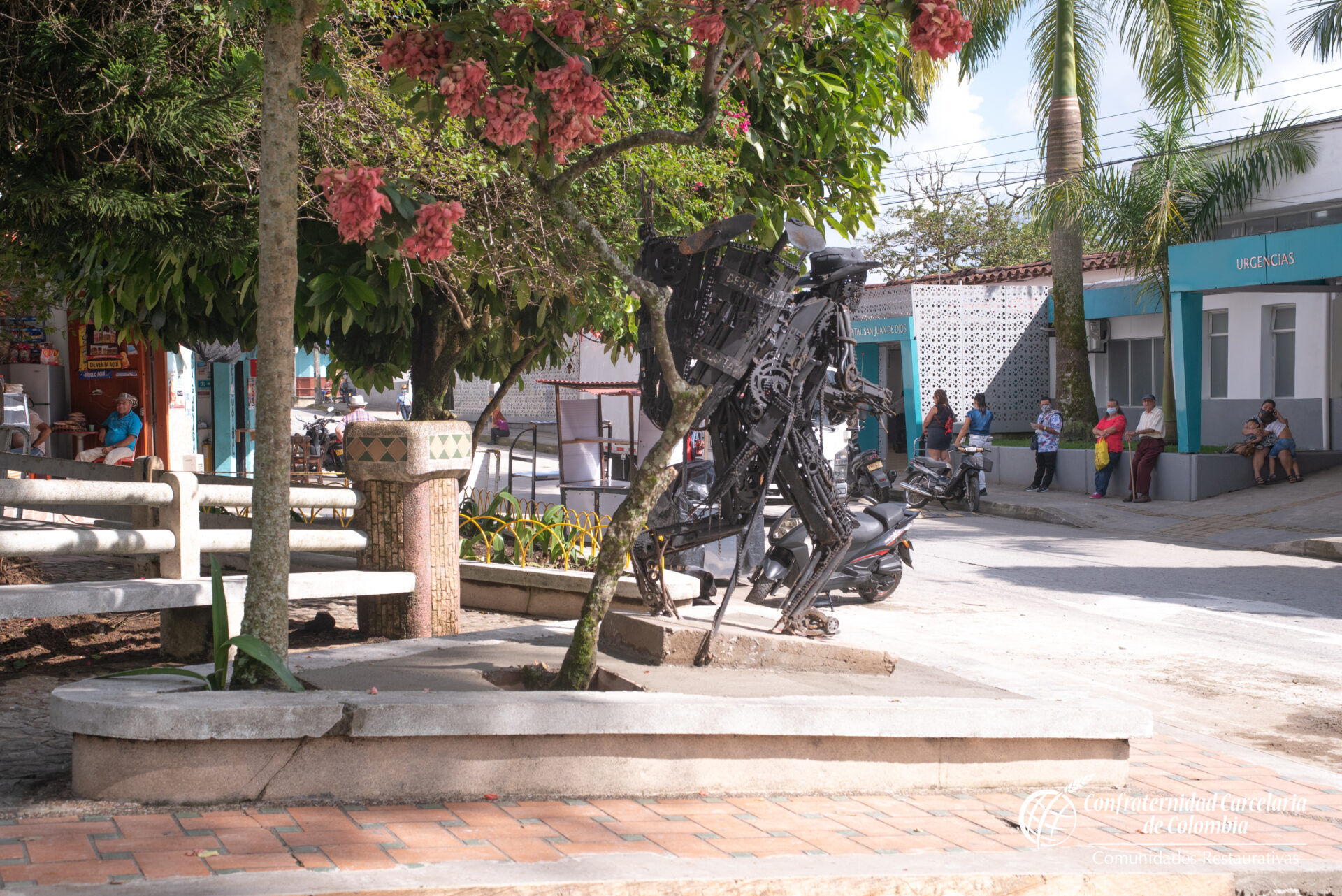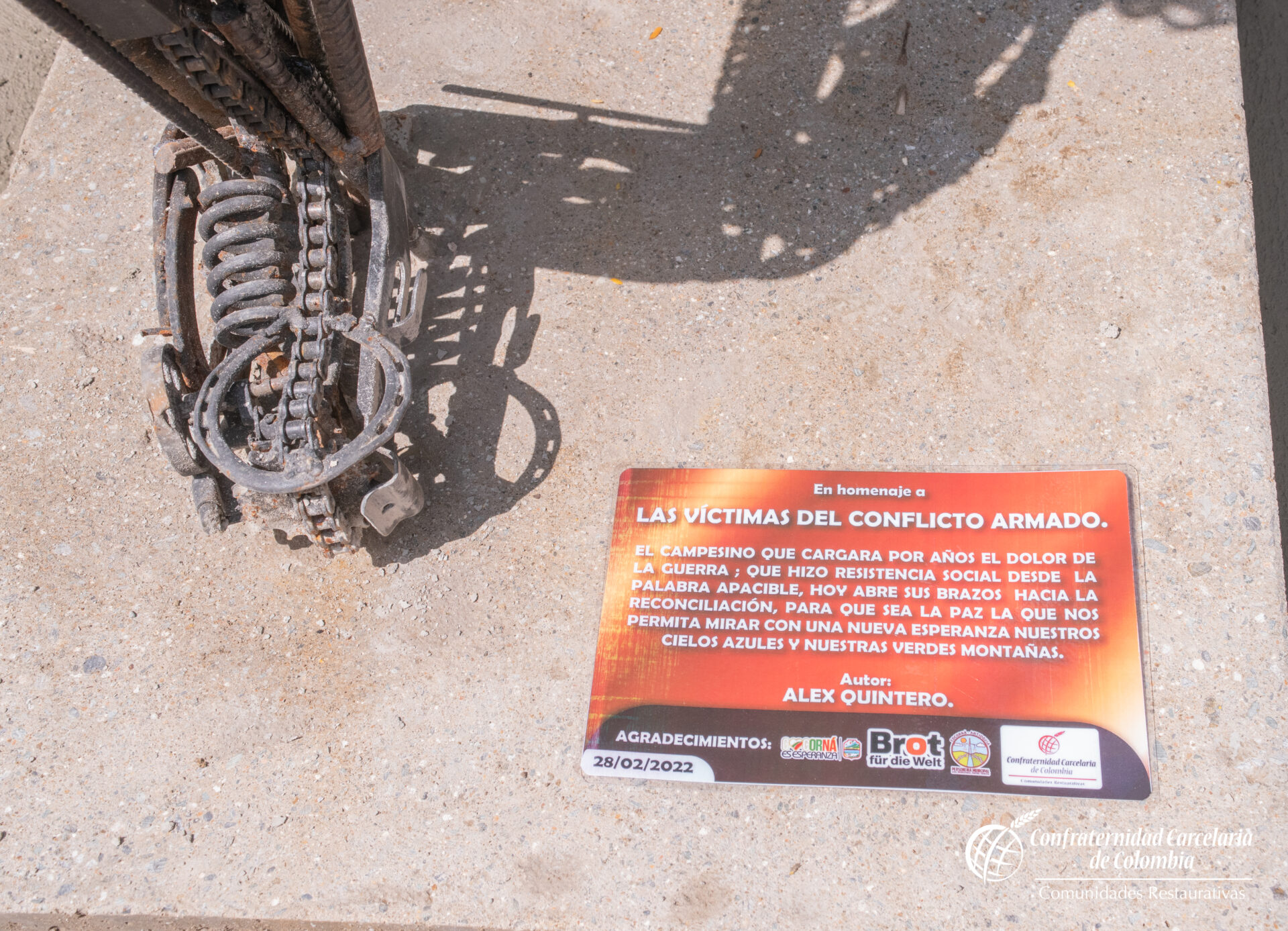 Nach einer Abschlussfeier der Gesprächsrunden im Militärgefängnis haben Opfer und Täter gemeinsam mit Vertreter der Dorfgemeinschaft den Park restauriert und wiederhergerichtet. Gemeinsam mit dem Künstler Alex Quintero haben sie ein Denkmal für den Frieden erstellt. Aus dem Krieg stammende Metallelemente wurden ein Bauer erstellt, der aus seinen Schultern die Last des Krieges trägt, einschließlich Vertreibung, Zwangsrekrutierung, Entführungen und Mord. In seinen Armen trägt er Blumen, die für Hoffnung, Vergebung und Neuanfang stehen.